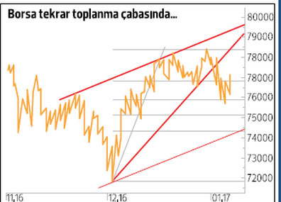 Kâr satışlarının etkisiyle kısa dönem çıkış trend desteğinin altına salınım gösteren endekste ilk destek 75.600 seviyesinde oluştu. Sonraki destek noktası 74.500 seviyesinde. Yukarı yönlü çıkış denemelerinde ise ilk dirençler 78.000-78.400 olarak görülüyor. Çıkışın devamı ve endeksin güç kazanması için 78.400 seviyesinin geçilmesi gerekecek. Düşüş sonrası tepki yükselişi görülmekle birlikte direnç seviyelerinde satışla karşılaşılabilir.
