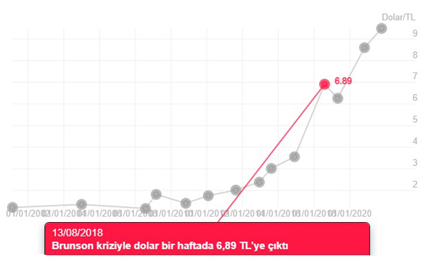Casusluk yaptığı suçlamasıyla 9 Aralık 2016'da tutuklanan ABD'li Rahip Andrew Brunson'ın ev hapsine alınması sonrası, ABD’den peş peşe sert açıklamalar geldi. Brunson'ın serbest bırakılmaması durumunda Türkiye'ye ekonomik yaptırım uygulanacağının duyurulmasıyla Ağustos ayı başında 5 TL olan dolar bir hafta içerisinde 6,5 TL seviyesini geçti. 12 Ağustos gecesi uluslararası piyasalarda 7,20 TL’yi test etti. Ekim 2018'de Brunson'un serbest bırakılmasının ardından dolar yeniden 5 TL seviyesinin üzerine geriledi. Dolar kuru 2018 yılını 5,29 TL’den kapattı.