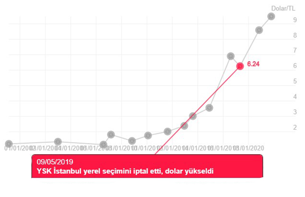 31 Mart 2019’daki yerel seçimlerde AKP en fazla belediye başkanlığı kaybeden parti oldu. Başkent Ankara dahil, birçok kritik il ve büyükşehri rakip adaylar kazandı. Yüksek Seçim Kurulu, İstanbul Büyükşehir Belediye Başkanlığı seçiminin iptaline ilişkin AKP’nin yaptığı itirazıysa 36 gün sonra kabul etti, seçimin yenilenmesine karar verdi. YSK’nın açıklamasıyla Türk Lirası dolar karşısında son ayların en büyük değer kaybını yaşadı, 9 Mayıs günü 6,24 TL’den işlem gördü.