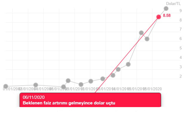 9 kez üst üste faiz indirimi yapan Merkez Bankası Başkanı Uysal, çift haneden düşmeyen enflasyon karşısında Eylül ayında ilk kez politika faizinde artırıma gitti. Bu adım Türk Lirası’nı destekledi. Ancak Ekim ayında faizin sabit tutularak piyasadaki artış beklentisinin karşılanamaması liradaki değer kazancını tersine çevirdi. 6 Kasım 2020’de 1 dolar 8,58 TL’den işlem gördü.