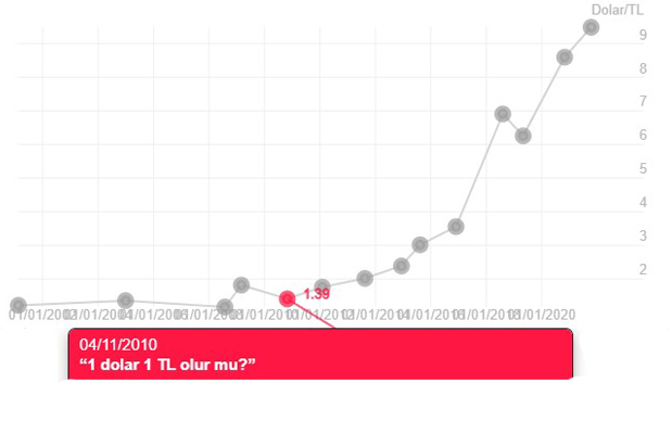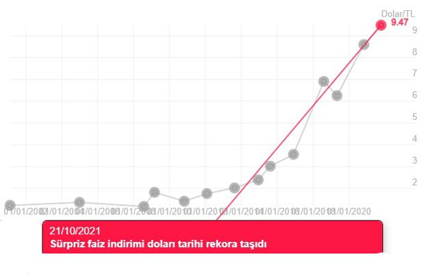 18 Ekim’de dolar 9,32 TL’ye yükselerek tarihi rekor kırdı. 21 Ekim’de Merkez Bankası’nın politika faizini sürpriz bir şekilde 200 baz puan indirmesiyle, dolar 9,47 seviyesini görerek bir rekor daha kırdı.(VOA Türkçe)