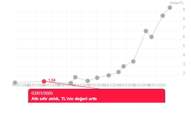 Bankalarının yarısı iflas eden, enflasyonu üç haneli rakamlara ulaşan ve para birimi yüzde 100 değer kaybeden Türkiye’de Kasım 2002’de iktidarı AKP devraldı. AKP hükümeti katı bütçe disipliniyle krizle mücadele ederek ekonomiyi büyüttü, tüketim ve yatırımları hızlandırdı, enflasyonu tek haneye düşürdü, reel faizler hızla indi. 31 Aralık 2004 tarihindeyse, Türk Lirası’na itibar kazandırmak için liradan 6 sıfır atılması ve 1 milyon liranın 1 Yeni Türk Lirası’na (YTL) eşitlenmesini öngören ilgili kanun çıkarıldı. Ekonomistler yabancı yatırımcının sıfırları sayamadığı bir para birimine güveni olamayacağını savunuyordu. Bu adımın ardından piyasaların açıldığı ilk gün 3 Ocak 2005 tarihinde dolar 1,34 YTL olarak kayıtlara geçti. Türk Lirası 2005 yılında değer kazanmaya devam etti.