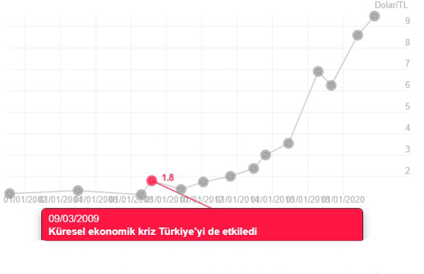 Gelişmekte olan ülkeler krizden nispeten daha az etkilense de küresel krizin yansımalarıyla Türkiye’de de ekonomi daraldı, işsizlik arttı. Kriz öncesi 1,20 düzeylerinde seyreden ve “1 dolar 1 TL olur mu” tartışmaları yapılan dolar kuru, 9 Mart 2009 tarihinde Merkez Bankası’nın efektif dolar satış fiyatı olan 1,80 TL’ye çıkarak rekor kırdı.