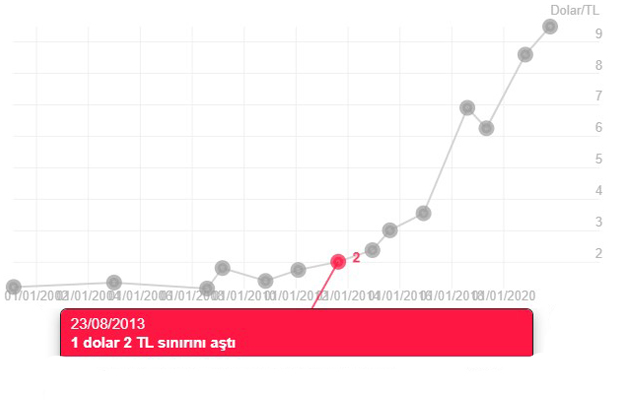 Dalgalı kur rejimine geçilen 2001 yılından beri geçen 12 yılda 2 TL’nin altında seyreden dolar, ilk kez 2013’te 2 lira sınırını aştı. 2013 yılının başında 1,70-1,80 TL aralığında olan dolar kuru, Mayıs ayında İstanbul Gezi Parkı’nda başlayan ve tüm Türkiye’ye yayılan hükümet karşıtı eylemlerle yükselişe geçti. 23 Ağustos 2013’te 1 dolar 2 TL seviyesini gördü. Dönemin Başbakanı Erdoğan doların yükselişini Gezi Parkı eylemleriyle ilişkilendirerek Türkiye ekonomisinin hedef alındığını savundu. Erdoğan, Gezi Parkı eylemlerini, faiz lobisinin başlattığını öne sürdü.
