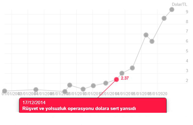 17-25 Aralık operasyonunun arifesi olan 14 Aralık 2014’te Gülen hareketine bağlı olduğu iddia edilen medya kuruluşlarına da operasyonlar düzenlendi, birçok kişi gözaltına alındı. Hem muhalefet partileri hem de ABD ve AB, hükümetin tutumuna karşı çıktı. 2013 ve 2014 yıllarında ardı ardına yaşanan siyasetteki huzursuzluğun dolara yansıması sert oldu. 17 Aralık 2014’te 1 dolar 2,37 TL’ye kadar yükselerek rekor kırdı.