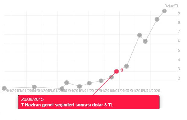 7 Haziran 2015'te yapılan genel seçimler öncesi ve sonrasında siyasette gerilimin yükselmesi doları da uçurdu. Türkiye, 7 Haziran seçimlerine, 5 Haziran’da Diyarbakır’daki HDP mitingine yönelik bombalı saldırının etkisinde girdi. IŞİD tarafından üstlenilen saldırıda 5 kişi yaşamını yitirdi, 400’e yakın kişi de yaralandı. Seçimlerdeyse 2002'den beri tek başına iktidar olan AKP meclisteki çoğunluğunu kaybetti. Türkiye’de yıllar sonra koalisyon hükümeti ihtimali doğdu. Ancak meclise giren partilerin hiçbiri koalisyon seçeneğinde anlaşamayınca hükümet kurulamadı. Dolar, 2015 Ağustos’unda ilk kez 3 TL’yi gördü. Cumhurbaşkanı Erdoğan hükümetin kurulamaması üzerine erken seçim kararı aldı.
