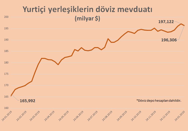 Dünya Gazetesi derlemesine göre, 17 Ocak ile biten haftada 197 milyar 122 milyon dolara yükselen ve rekor kıran yurt içi yerleşiklerin döviz mevduatı, 24 Ocak haftasında yaklaşık 810 milyon dolar geriledi ve 196 milyar 306 milyon oldu. Söz konusu tutarın 121 milyar 526 milyon dolarını yurt içinde yerleşik gerçek kişiler, 74 milyar 780 milyon doları da yurt içinde yerleşik tüzel kişilerin mevduat hesapları oluşturdu.