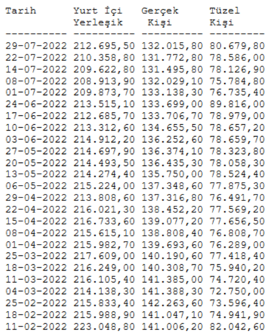 Türkiye Cumhuriyet Merkez Bankası(TCMB) tarafından açıklanan verilere göre, bir önceki hafta 210 milyar 358,8 milyon dolar olan yurt içi yerleşiklerin döviz mevduatı 29 Temmuz ile sona eren haftada 212 milyar 695,5 milyon dolara geldi.