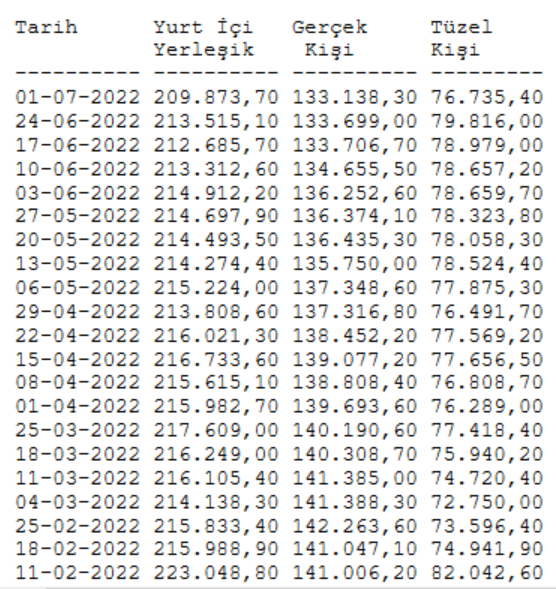 Türkiye Cumhuriyet Merkez Bankası(TCMB) tarafından açıklanan verilere göre, bir önceki hafta 213 milyar 515,1 milyon dolar olan yurt içi yerleşiklerin döviz mevduatı 1 Temmuz ile sona eren haftada 209 milyar 873,70 milyon dolara geldi.