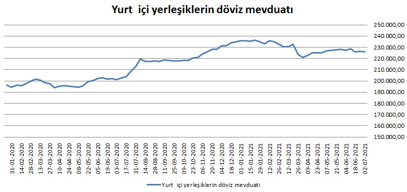Yurt içi yerleşiklerin döviz mevduatı 510,4 milyon dolar düşüş gösterdi. Türkiye Cumhuriyet Merkez Bankası(TCMB) tarafından açıklanan verilere göre, bir önceki hafta 226 milyar 534,30 milyon dolar olan yurt içi yerleşiklerin döviz mevduatı 2 Temmuz ile sona eren haftada 226 milyar 23,9 milyon dolara geldi.