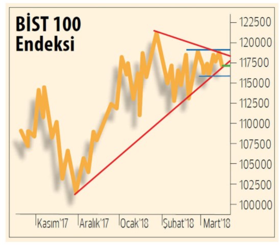 Dış borsaların seyri, faiz artışı beklenen 21 Mart ABD Merkez Bankası (Fed) toplantısı, ABD Başkanı Trump tarafından getirilen alüminyum ve çeliğe ek gümrük vergi uygulamasının yansımaları, Türkiye’nin Afrin harekatı yakından izlenen diğer gündem konuları. Dış borsalardaki toparlanma çabaları güç kazanamadı. Dow Jones (ABD) ve Dax (Almanya) gibi öncü endekslerin zirve seviyelerine ulaşma çabaları yeterli olmadı ve son günlerde tekrar zirveden uzaklaşmaya başladılar. Ancak ABD Doları (dolar endeksi), altın fiyatları ve ABD uzun dönem tahvil faiz oranları sakin ve az da olsa geriliyor. İç piyasalarda özellikle döviz ve faiz tarafı olmazsa da Borsaistanbul dış borsalara ve dışarıdaki havaya daha uyumlu hareket ediyor. Doların dışarıda değer kaybına bağlı olarak dolar/TL kuru henüz 3.98 zirvesini geçemedi ancak Euro/TL kuru ve döviz sepetinde zirveler geçilip rekorlar tazelendi. Döviz kurlarındaki bu hareketin borsa üzerindeki baskısı hissediliyor. Diğer yandan piyasaların Türkiye’nin Afrin harekatına tepkisizliği sürüyor. Ancak Afrin merkezine girişin an meselesi olduğu açıklamaları bu yöndeki haber akışına duyarlılığı artırabilir. Piyasalarda temkinli görünüm korunabilir.