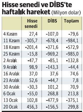 Yabancıların 13-20 Ocak haftasında hisse senedinde 456 milyon dolarlık alım yaptığı, devlet iç borçlanma senedinde (DİBS) ise 156 milyon dolarlık satış gerçekleştirdikleri görüldü. Böylece net alım 300 milyon dolar oldu.