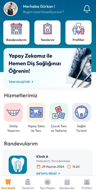 Bizim yaptığımız bu program sayesinde, kendiniz durumunuzu -aynı Sağlık Bakanlığımızın e-nabız programında olduğu gibi- sürekli takip edebiliyorsunuz. Kendi diş problemlerinizin en azından ne durumda olduğunun, verdiğiniz soru cevaplarla, yükleyeceğiniz fotoğraflarla karşılığını alabiliyorsunuz. Bu çıkan radyolojik bulguları yapay zeka ile hekiminizle de paylaşabiliyorsunuz.