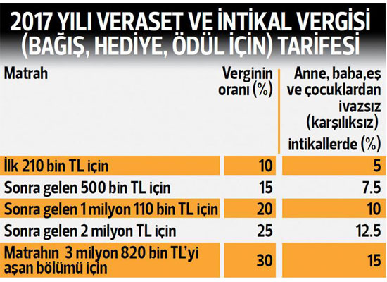 BU konuda diğer bir kritik konu ise vergi ödenecekse nasıl hesaplanacağı ve ne kadar ödeneceği? Vergi oranları yüzde 10’dan başlayıp yüzde 30’a kadar yükseliyor. Ancak anne, baba, eş ve çocuklardan alınan bağış-hediye için tarife yüzde 50 indirimli olarak uygulanıyor (VİV Md. 16). Hediyeyi alan için beyanname verme süresi bir ay (VİV Md. 9/2). Sonrasında ödeme, üç yılda ve altı taksitte (Mayıs ve Kasım aylarında) yapılabiliyor (VİV Md. 19).