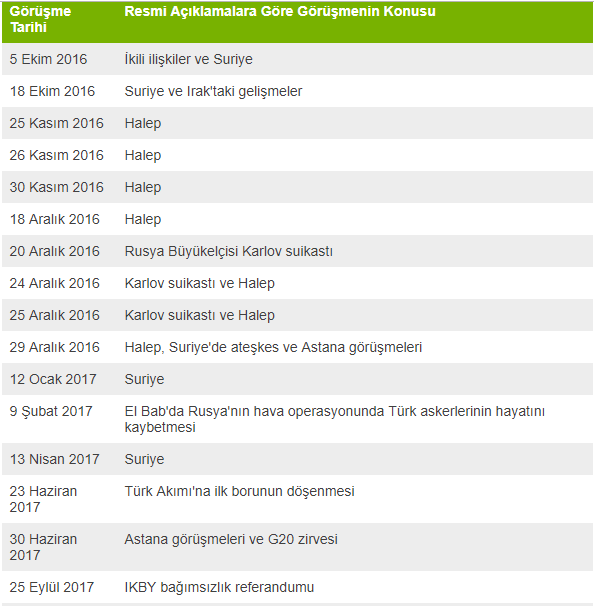 Putin ile Erdoğan'ın en yeniden en eskiye, Ağustos 2016'dan bu yana yaptıkları bazı görüşmeler ve bu görüşmelerde alınan kararlar şöyle: