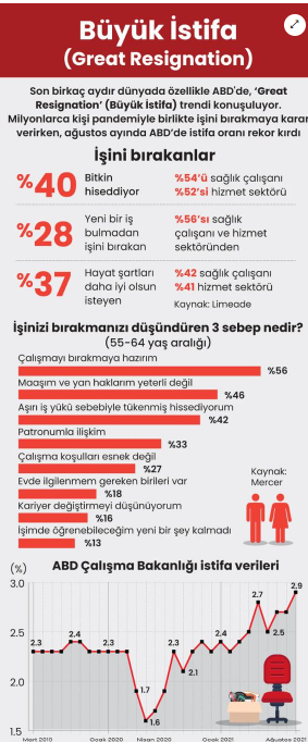 ABD Çalışma Bakanlığı, 2021 Ağustos ayında 4 milyon 300 bin kişinin işinden ayrıldığını açıkladı. Böylelikle, ABD iş gücünde yüzde 2.9'luk bir kısım işini bıraktı; bu veri bugüne kadar kaydedilmiş en yüksek istifa oranı olarak kaydedildi. Öte yandan, İngiltere’de ağustos ayında 1 milyonu aşkın açık iş pozisyonu bulunuyordu. Microsoft’un araştırmasına göre çalışanların yüzde 41’i gelecek yıl işini değiştirmeyi düşünüyor.