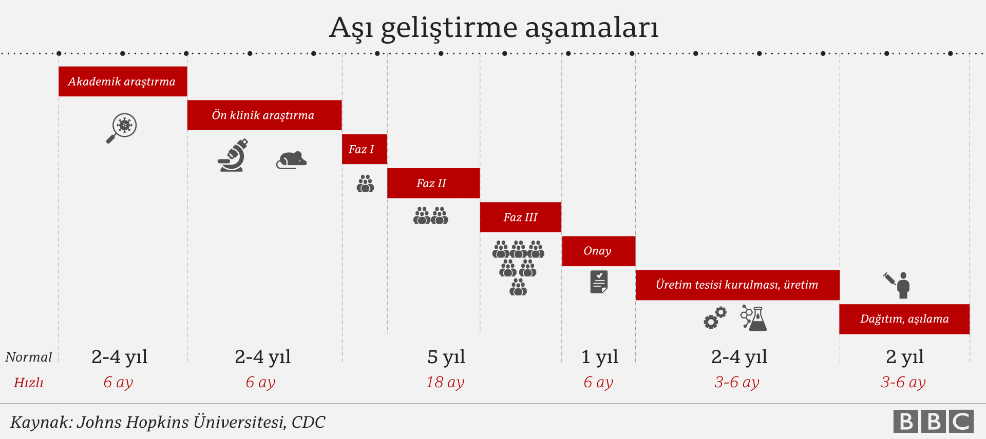 Akademik araştırma ile başlayan bu süreç, laboratuvar ortamında yapılan araştırma ve deneylerle devam ediyor. Klinik deneyler ve ardından onay ve üretim aşamaları, en nihayetinde dağıtım ve aşılama aşamaları ile son buluyor.