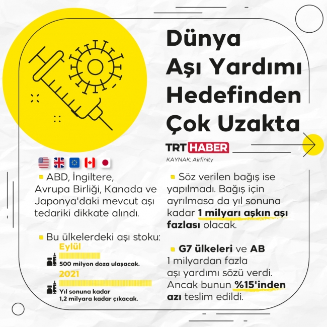 Almanya, ABD, Birleşik Krallık, Fransa, İtalya, Japonya ve Kanada olmak üzere yedi ülkeden oluşan G7 ülkeleri ve AB ise 1 milyardan fazla doz aşı yardımı sözü verdi. Ancak bunun şimdiye kadar yüzde 15'ten daha azı iletildi.