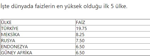Global-rates'in verilerine göre Türkiye'den sonra dünyada politika faizinin en yüksek olduğu ülke yüzde 8.25 ile Meksika onu, yüzde 7.5 ile Rusya, yüzde 6.5 ile Endonezya ve yüzde 6.5 ile Güney Afrika izliyor.
