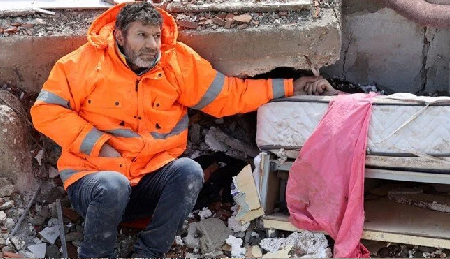Fotoğraf karesinde Mesut Hancer, Türkiye'nin güneydoğusunda meydana gelen 7,8 büyüklüğündeki depremin ertesi günü, depremin merkez üssüne yakın Kahramanmaraş'ta meydana gelen depremde hayatını kaybeden 15 yaşındaki kızı Irmak'ın elini tutuyor.