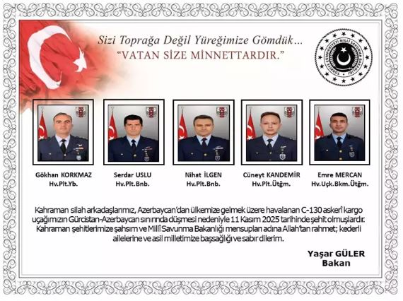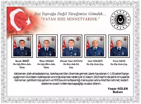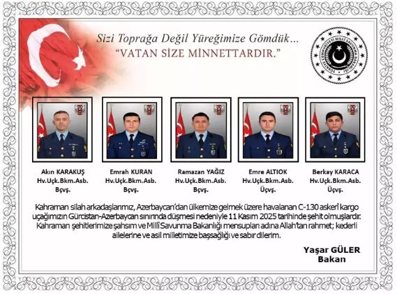 Milli Savunma Bakanı Yaşar Güler, taziye mesajında, "Kahraman silah arkadaşlarımız, Azerbaycan'dan ülkemize gelmek üzere havalanan C130 askeri kargo uçağımızın Gürcistan-Azerbaycan sınırında düşmesi nedeniyle 11 Kasım 2025 tarihinde şehit olmuşlardır. Kahraman şehitlerimize şahsım ve Milli Savunma Bakanlığı mensupları adına Allah'tan rahmet, kederli ailelerine ve asil milletimize başsağlığı ve sabır dilerim." ifadelerini kullandı.