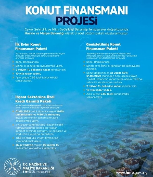 İkinci başlığımız olan Genişletilmiş Konut Finansman Paketi'nde ise “Liralaşma stratejimizi" destekleyecek biçimde konut değerinin en az yüzde 50’si 01.04.2022 tarihinden önce açılmış DTH’ın yahut hurda altının TCMB’ye satımı ile karşılanması şartıyla devreye alınacaktır.