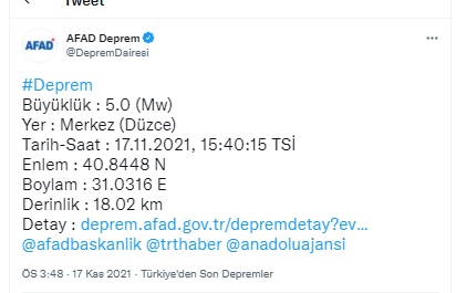 Afet ve Acil Durum Yönetimi Başkanlığı Deprem Dairesi Başkanlığının (AFAD) internet sitesinde yer alan bilgiye göre, Düzce Merkez'de 5,0 büyüklüğünde bir deprem meydana geldi.