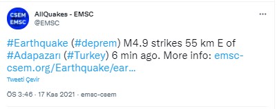 Sonrasında yaptığı duyuruda 4,9 şiddetinde Adapazarı merkez üssü olarak duyurdu.