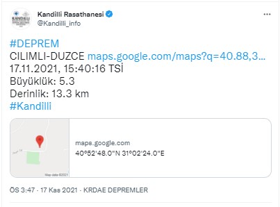 Kandilli Rasathanesi sitesinde Düzce Cilimli merkez üssünde 5,3 şiddetinde meydana geldiği belirtildi.