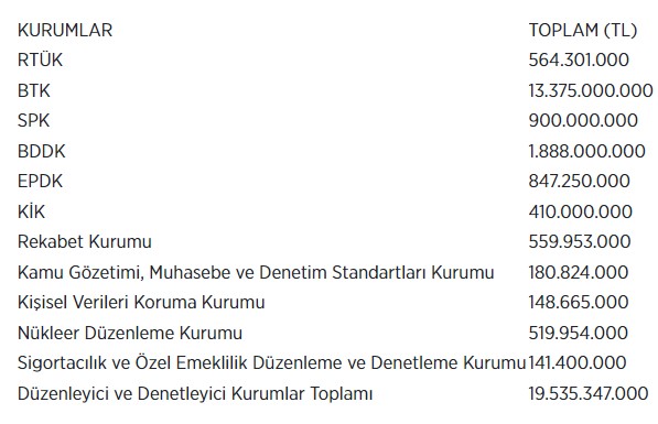 Gelecek yıl bütçesinden Bankacılık Düzenleme ve Denetleme Kurumuna (BDDK) 1 milyar 888 milyon lira, Enerji Piyasası Düzenleme Kurumuna (EPDK) 847 milyon 250 bin lira, Sermaye Piyasası Kuruluna (SPK) 900 milyon lira, Radyo ve Televizyon Üst Kuruluna (RTÜK) 564 milyon 301 bin lira, Kamu İhale Kurumuna (KİK) 410 milyon lira, Rekabet Kurumuna 559 milyon 953 bin lira, Nükleer Düzenleme Kurumuna 519 milyon 954 bin lira, Kamu Gözetimi, Muhasebe ve Denetim Standartları Kurumuna 180 milyon 824 bin lira, Kişisel Verileri Koruma Kurumuna 148 milyon 665 bin lira, Sigortacılık ve Özel Emeklilik Düzenleme ve Denetleme Kurumuna 141 milyon 400 bin lira kaynak sağlanacak.