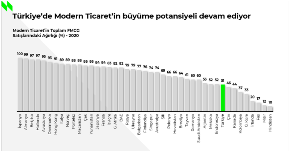 Bu dönemde e-ticaretin payının FMCG pazarında yüzde 6'ya ulaştığını ifade eden Erdoğan, “Türkiye, bu oranla e-ticaretin satış ağırlığında en önde geldiği Çin (yüzde 30), Güney Kore (yüzde 26) ve ABD (yüzde 15) gibi ülkeleri yakından takip ettiği gibi, Avrupa'da da e-ticaretin en çok ağırlığa sahip olduğu ülkeler arasında İngiltere (yüzde 15) ve Fransa (yüzde 9)'dan sonra yer alıyor.” dedi.