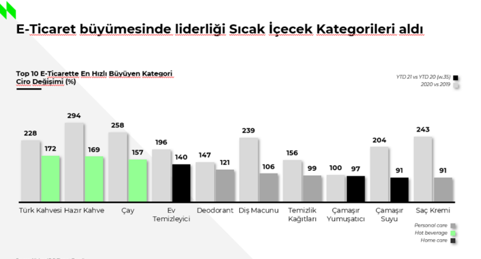 Rapora göre e-ticaret yüksek büyümesiyle tüm kategorilerde payını artırdı. Ancak büyümede liderliği sıcak içecek kategorileri aldı. NielsenIQ verilerine göre e-ticarette en çok büyüyen ilk 5 kategori Türk kahvesi, hazır kahve, çay, ev temizleyicileri ve deodorantlar oldu.