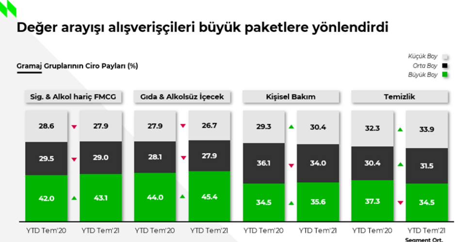 Ayrıca tüketiciye avantajlı fiyat sunan büyük gramajlı ürünlerin, gıda başta olmak üzere tüm alt gruplarda toplam satışlar içindeki ağırlıkları arttı.
