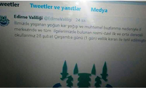 Edirne Valiliği adına açılan sahte hesap üzerinden, “İlimizde yaşanan yoğun kar yağışı ve muhtemel buzlanma nedeniyle il merkezinde ve tüm ilçelerimizde bulunan resmi, özel, ilk ve orta dereceli okullarımız 28 Şubat Çarşamba günü bir gün Valilik kararı ile tatil edilmiştir” ifadelerine yer verildi. Durumu gerçek zanneden öğrenci velileri, Edirne Valiliği resmi internet sitesini tararken, yapılan asılsız paylaşım sosyal medyada tartışmalara neden oldu.