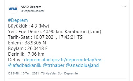 AFAD'dan yapılan açıklamada, "Ege Denizi'nde İzmir'in Karaburun ilçesi açıklarında saat 22.19'da 4,3 büyüklüğünde bir deprem meydana geldi. Gelişmeleri takip ediyoruz." denildi.