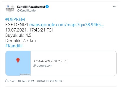Kandilli Rasathanesi ise depremin büyüklüğünü 4.5 olarak duyurdu.