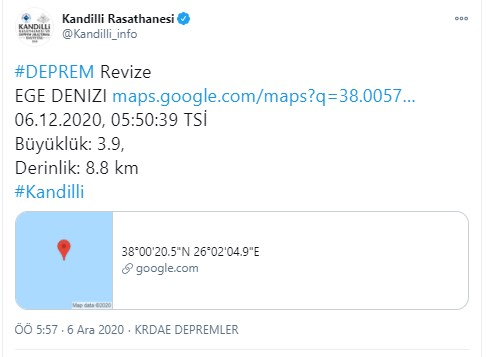 Kandilli Rasathanesi, saat 05:50'de Ege Denizi açıklarında 3.9 büyüklüğünde bir deprem meydana geldiğini duyurdu. Depremin derinliği 8.8 olarak açıklandı.