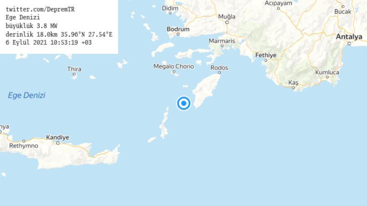 AFAD'ın geçtiği son dakika bilgilerine göre; Ege Denizi'nde Muğla'nın Datça ilçesine 81 kilometre uzaklıkta 3.8 büyüklüğünde bir deprem meydana geldi. Saat 10.53'te kaydedilen depremin derinliği 17 kilometre olarak ölçüldü.