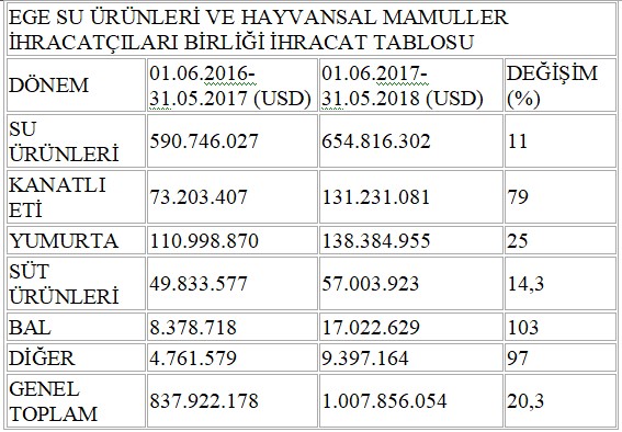 Ege Su Ürünleri ve Hayvansal Mamuller İhracatçıları Birliği’nin son 1 yıllık dönemdeki ihracatı yüzde 20’lik artışla 1 milyar 7 milyon dolara ulaştı. Birlik, 78 yıllık tarihinde ilk kez 1 milyar dolar barajını aşmayı başardı.