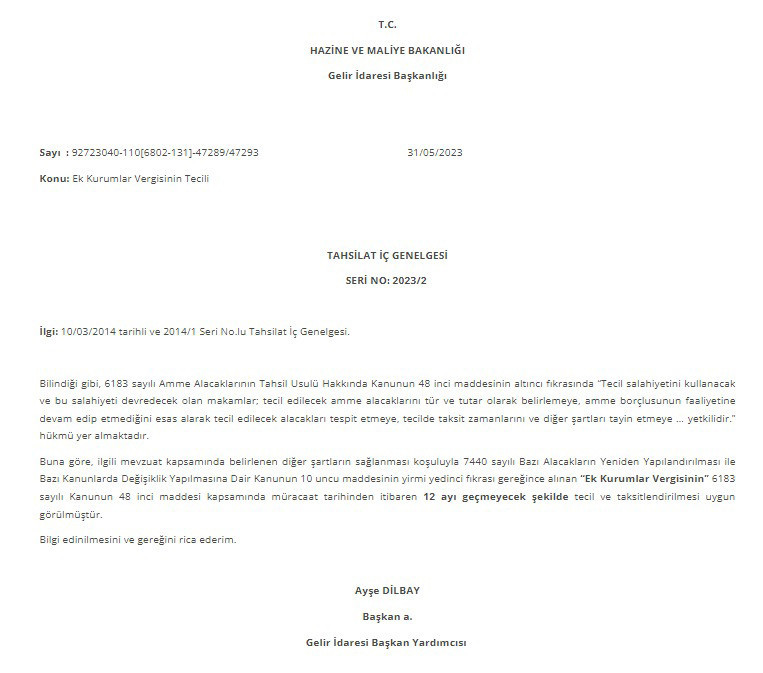 Maliye Bakanlığı bugün yayınladığı tahsilat iç genelgesi ile, ek verginin 12 aya kadar taksitlendirilmesine imkan sağladı.