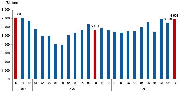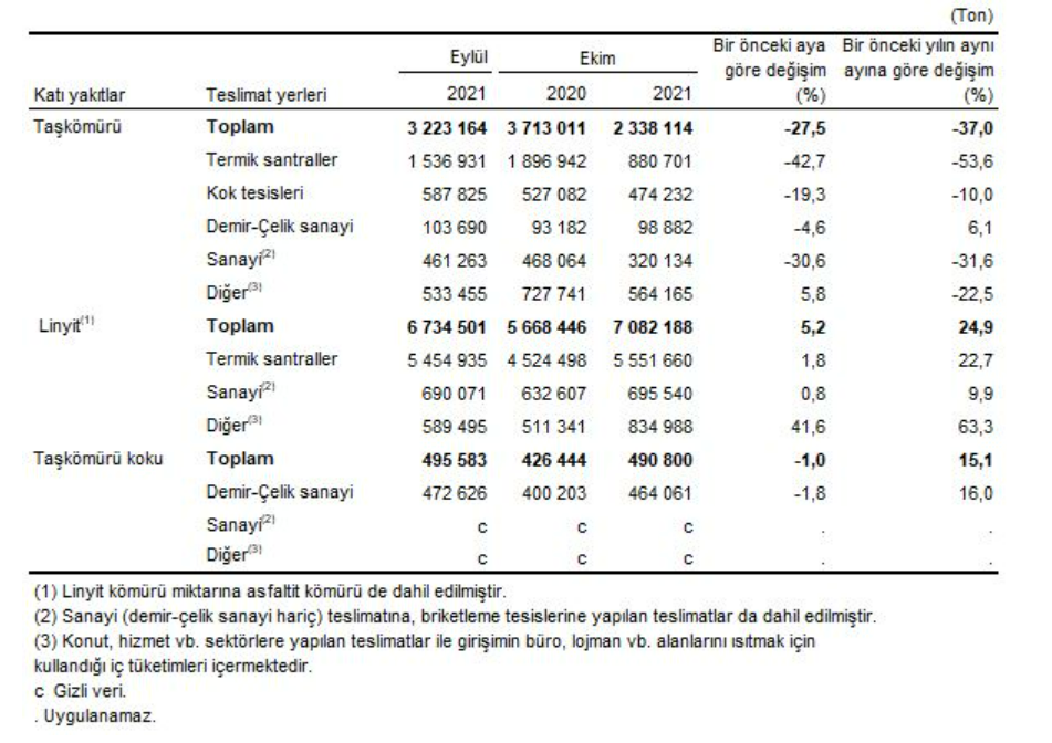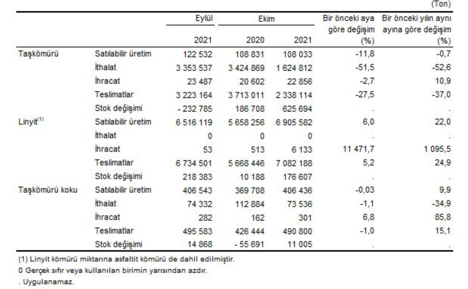 Katı yakıtların satılabilir üretim ve teslimat miktarları, Ekim 2021