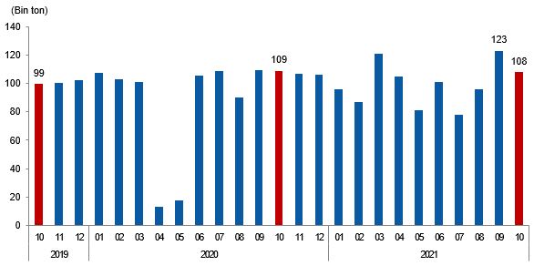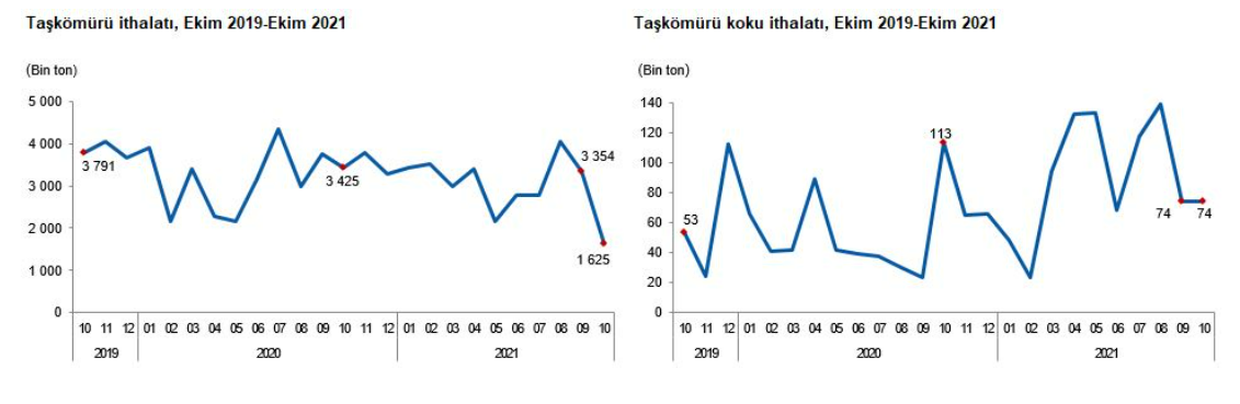 Taşkömürü ithalatı Ekim ayında bir önceki aya göre %51,5, bir önceki yılın aynı ayına göre ise %52,6 azaldı.