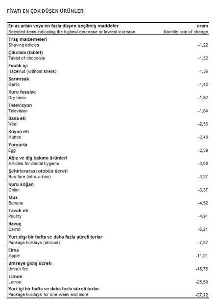 Ekim ayında fiyatı en çok düşen ürün ise yüzde 27 ile yurt içi turlar oldu. Onu yüzde 25.6 ile limon, yüzde 18.8 ile umre gidiş ücretleri, yüzde 11 ile elma, yüzde 7.5 ile de yurt içi turlar izledi.