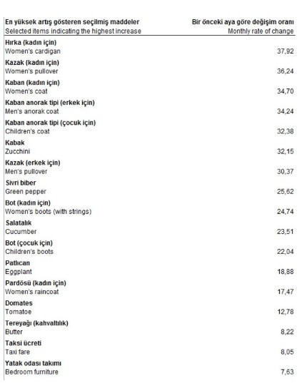 Ekim ayının zam şampiyonları da böylece belli olmuş oldu. Yüzde 37.92 oranla kadın hırkası zam şampiyonu olur iken, ikinci sırada yüzde 36.24 oranla kadın kazağı yer aldı. Sıralamayı yüzde 34.70 oranla kadın kabanı ve yüzde 34.24 oranla erkek kabanı, yüzde 32.38 oranla ise çocuk kabanı takip etti.