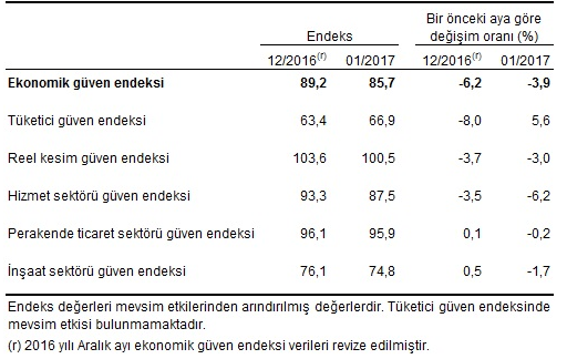 Ocak ayında hizmet sektörü güven endeksi 87,5 değerine, reel kesim (imalat sanayi) güven endeksi 100,5 değerine, inşaat sektörü güven endeksi 74,8 değerine ve perakende ticaret sektörü güven endeksi 95,9 değerine geriledi. Tüketici güven endeksi ise Ocak ayında 66,9