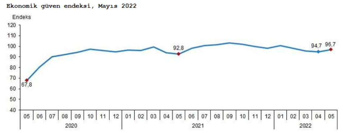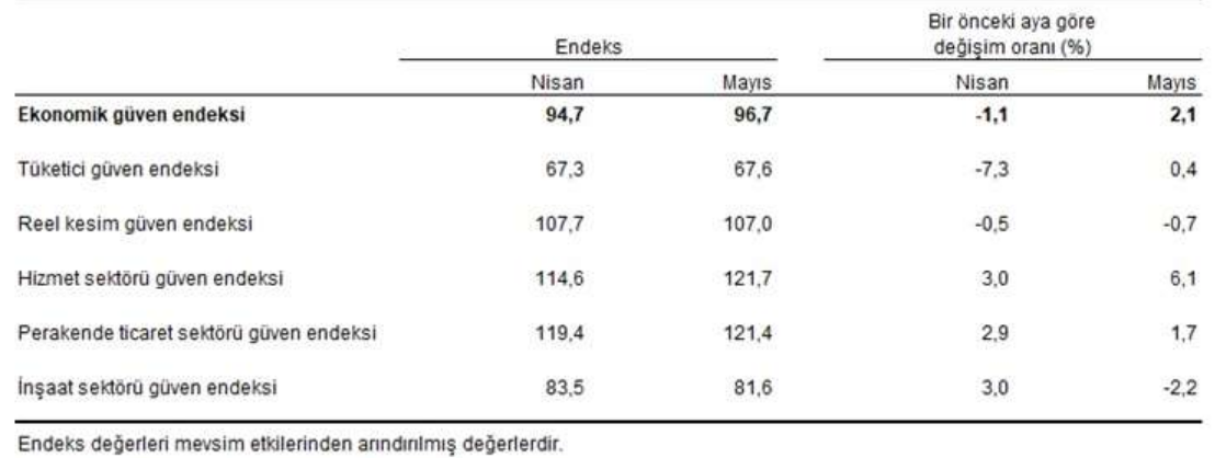 Türkiye İstatistik Kurumu (TÜİK) tarafından yapılan açıklamaya göre, ekonomik güven endeksi Nisan ayında 94,7 iken, Mayıs ayında %2,1 oranında artarak 96,7 değerine yükseldi. Ekonomik güven endeksindeki artış; tüketici, hizmet ve perakende ticaret sektörü güven endekslerindeki artışlardan kaynaklandı.