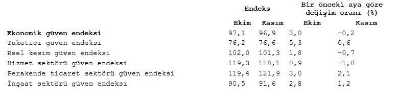 TÜİK'ten yapılan açıklamaya göre, bir önceki aya göre Kasım ayında reel kesim (imalat sanayi) güven endeksi %0,7 oranında azalarak 101,3 değerini, hizmet sektörü güven endeksi %1,0 oranında azalarak 118,1 değerini aldı. Tüketici güven endeksi %0,6 oranında artarak 76,6 değerini, perakende ticaret sektörü güven endeksi %2,1 oranında artarak 121,9 değerini, inşaat sektörü güven endeksi %1,2 oranında artarak 91,6 değerini aldı