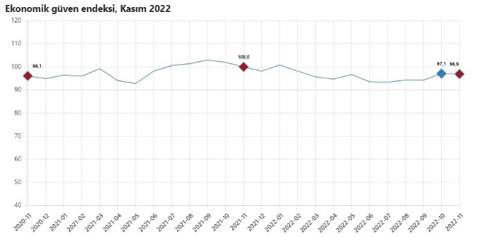 Buna göre, ekonomik güven endeksi ekim ayında 97,1 iken, kasım ayında yüzde 0,2 oranında azalarak 96,9 değerini aldı.