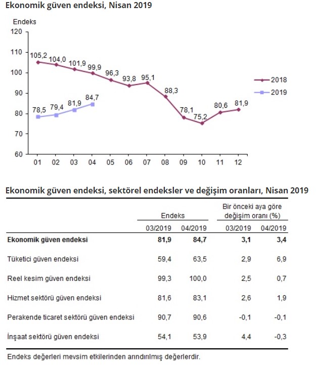 TÜİK verilerine göre ekonomik güven endeksi Mart ayında 81,9 iken, Nisan ayında %3,4 oranında artarak 84,7 oldu. Ekonomik güven endeksindeki artış, tüketici, reel kesim (imalat sanayi) ve hizmet sektörü güven endekslerindeki artışlardan kaynaklandı.
