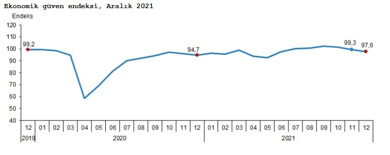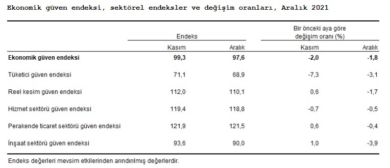 Tüketici güven endeksi bir önceki aya göre Aralık ayında %3,1 oranında azalarak 68,9 değerini, reel kesim güven endeksi %1,7 oranında azalarak 110,1 değerini, hizmet sektörü güven endeksi %0,5 oranında azalarak 118,8 değerini, perakende ticaret sektörü güven endeksi %0,4 oranında azalarak 121,5 değerini ve inşaat sektörü güven endeksi %3,9 oranında azalarak 90,0 değerini aldı.
